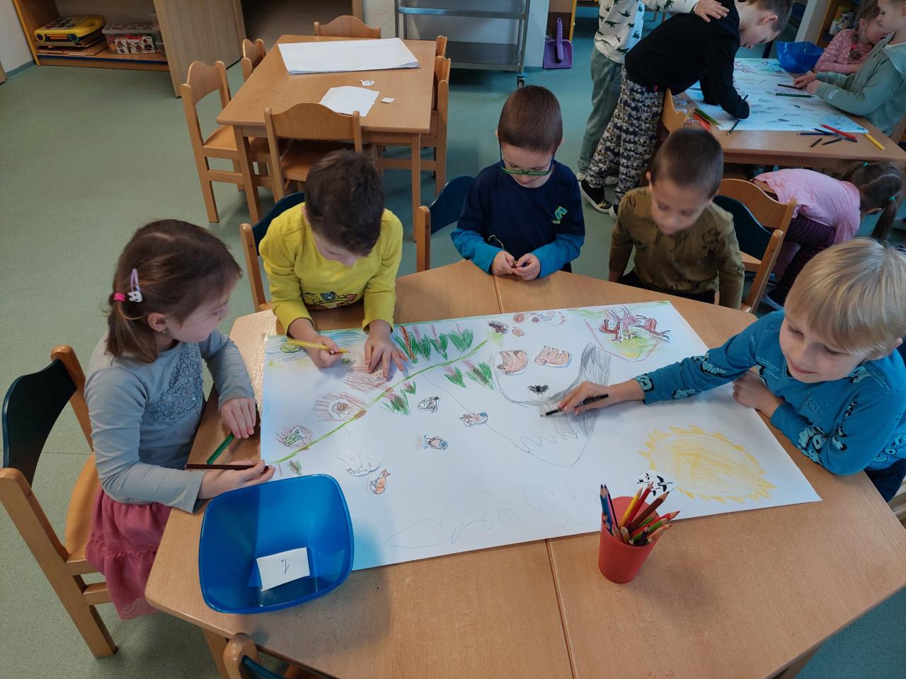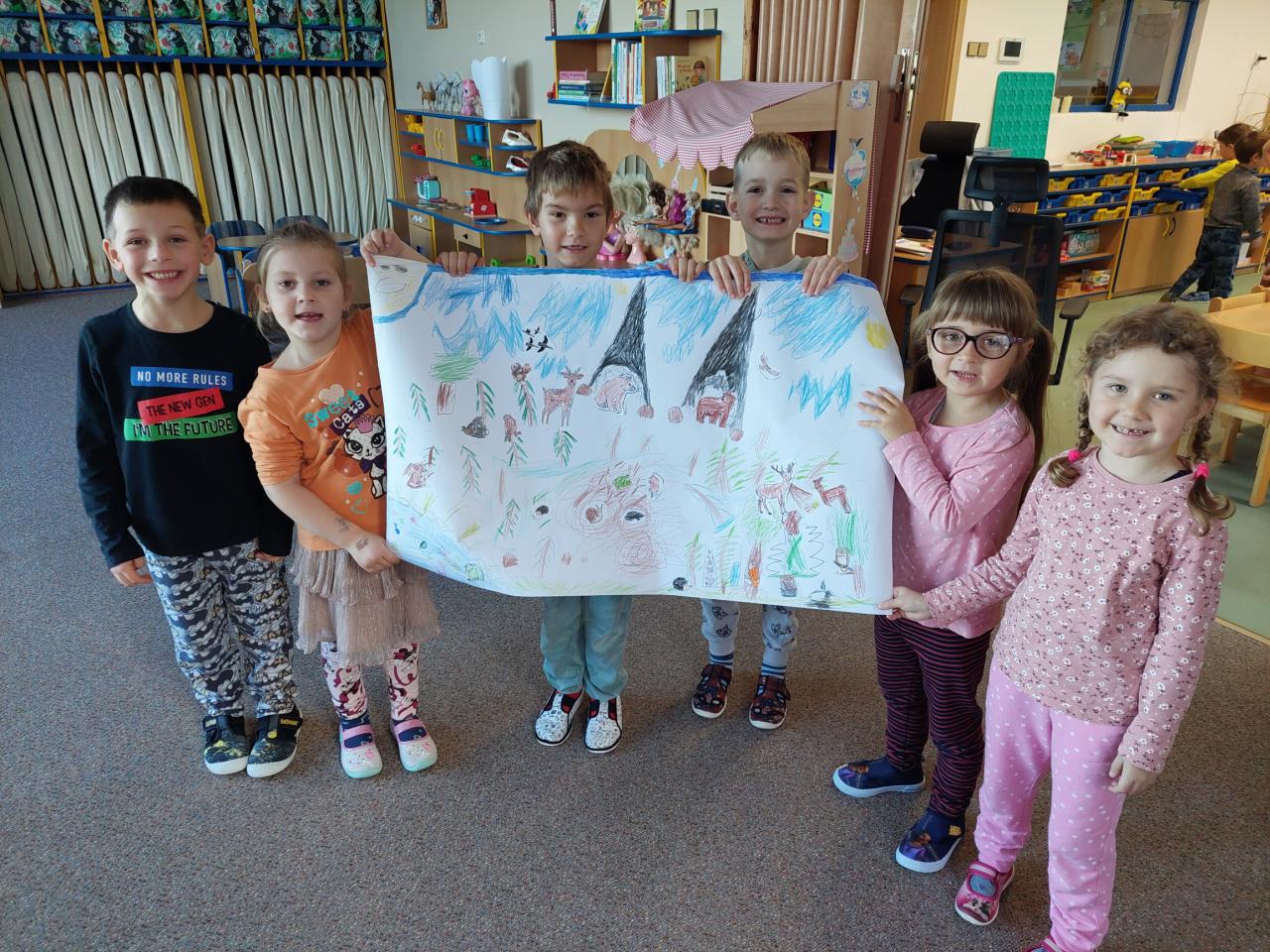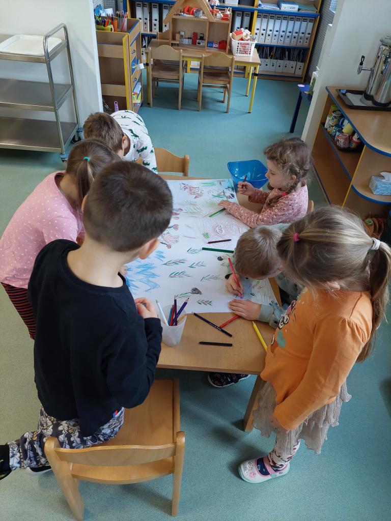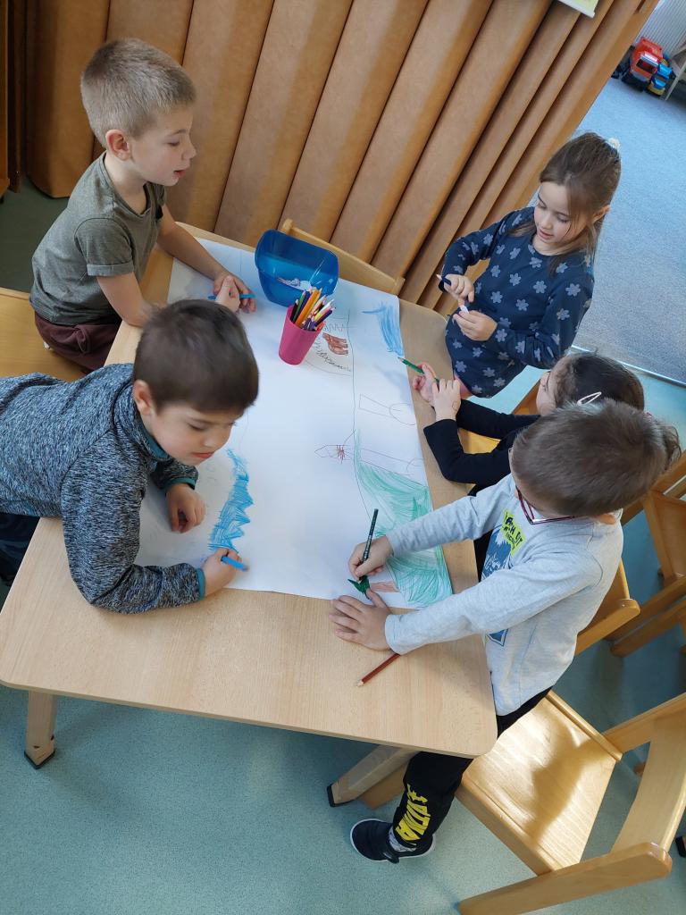 Děti si ve skupinkách vytvořily společné koláže, přírody a zvířátek připravujících se na zimu.