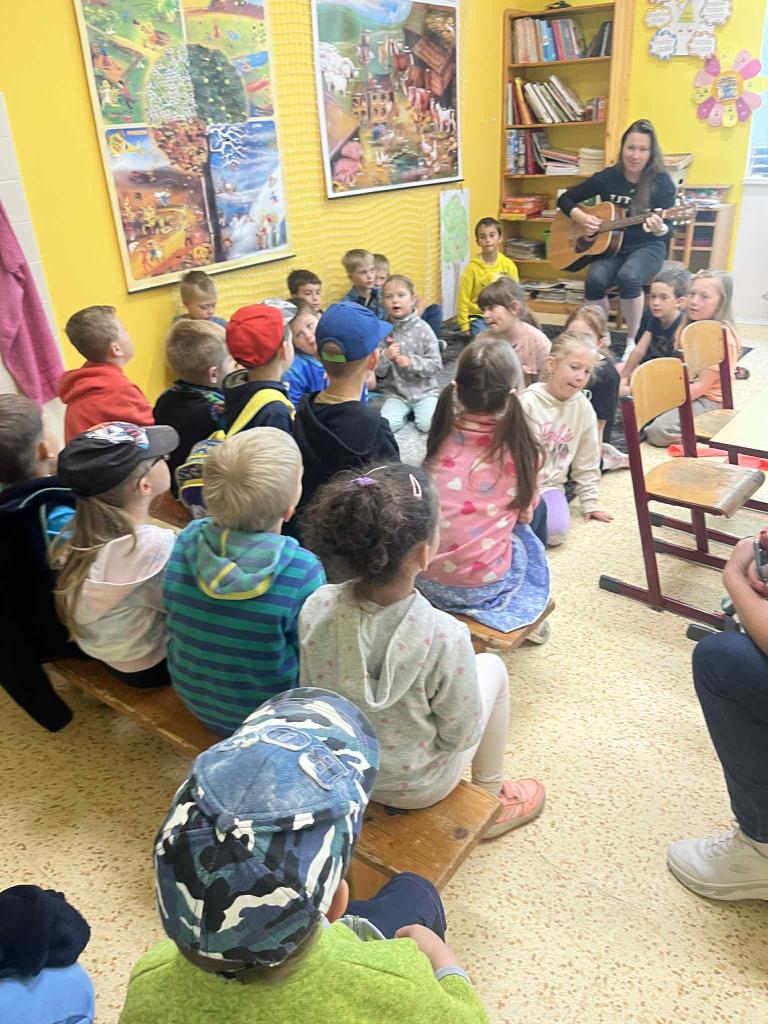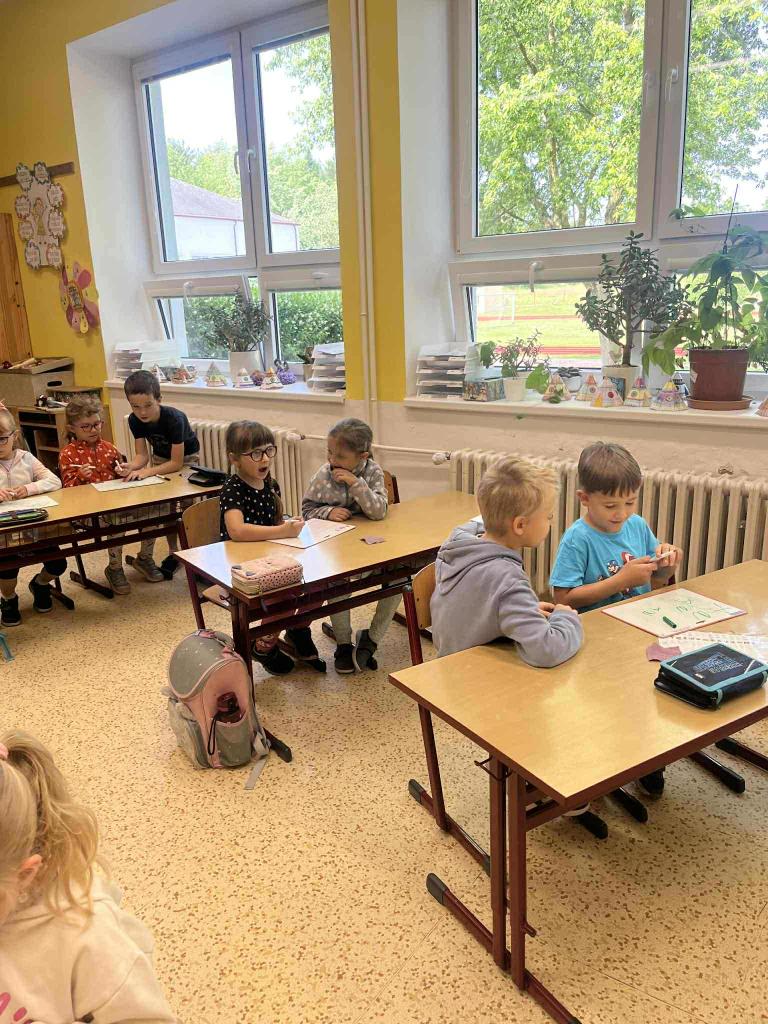 Děti ze třídy Sluníček navštívily 1. třídu. Prvňáčci nám ukázali co všechno už umí, a společně si vyzkoušeli jednoduché úkoly. Nechybělo ani zpívání a trošku tělocviku v tělocvičně. Moc jsme si to všichni užili.