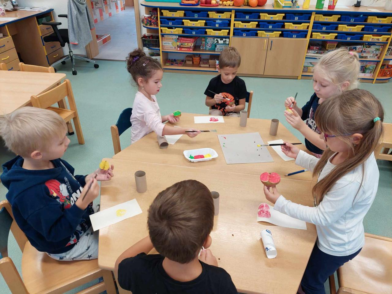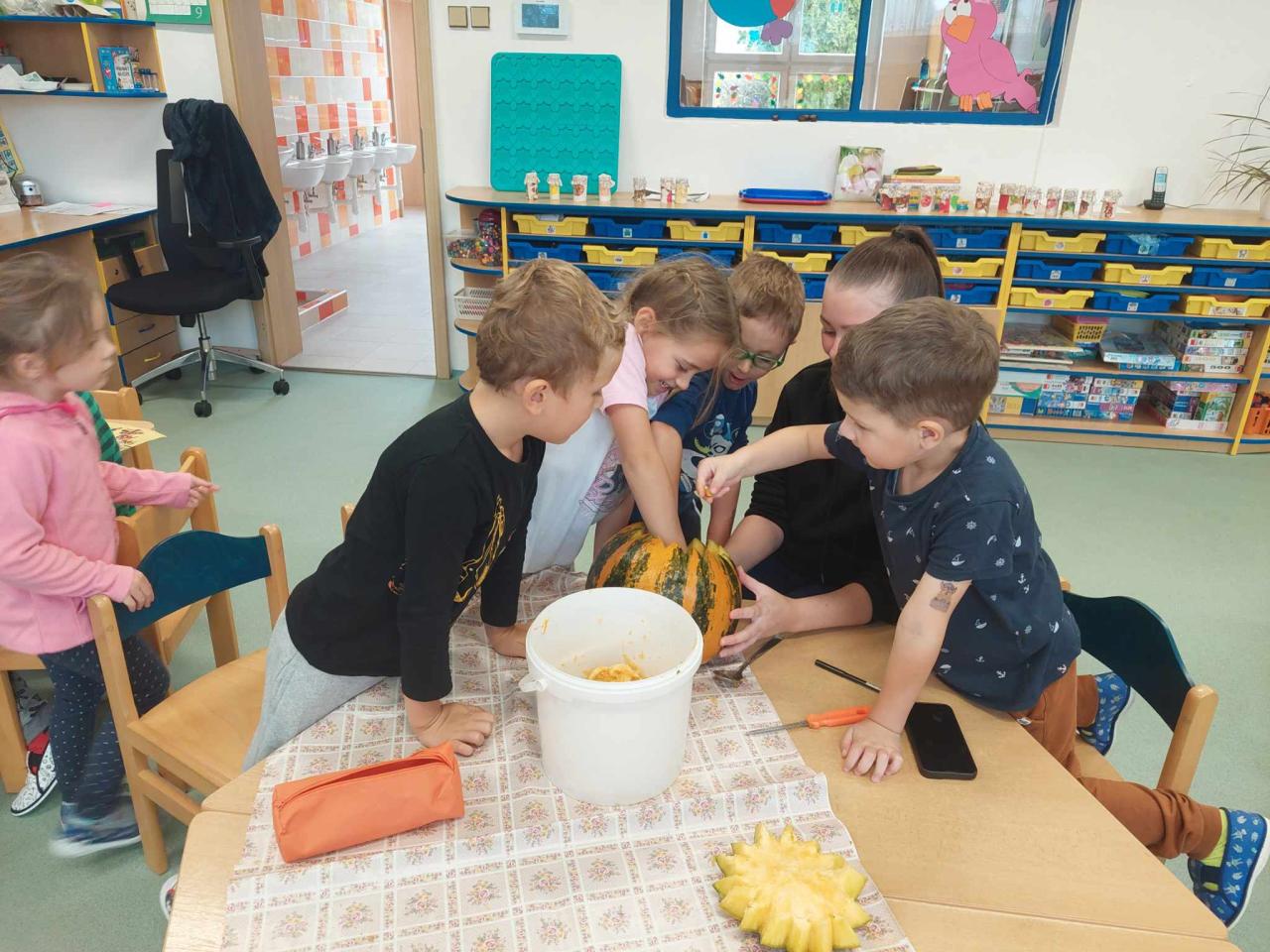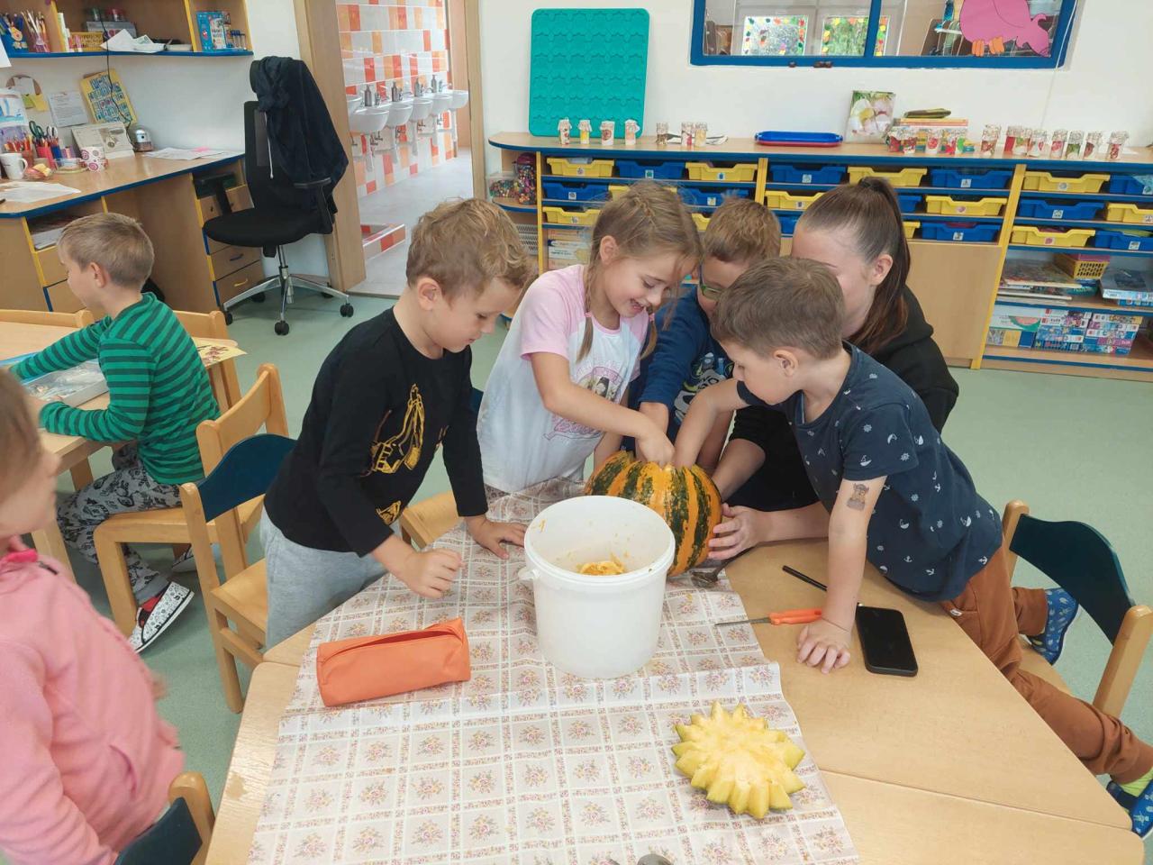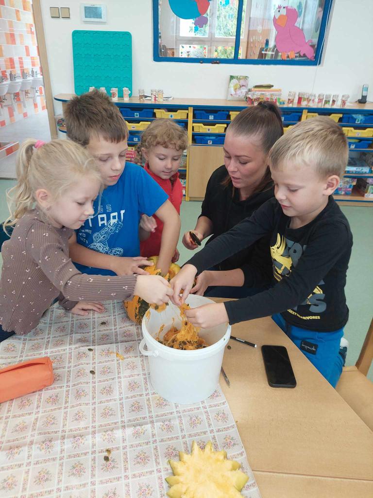Děti ze třídy "Sluníček" si vyrobily jablíčkovou zavařeninu a společně vydlabaly strašidelné dýně.