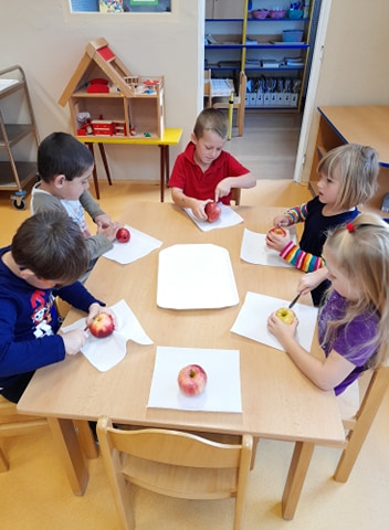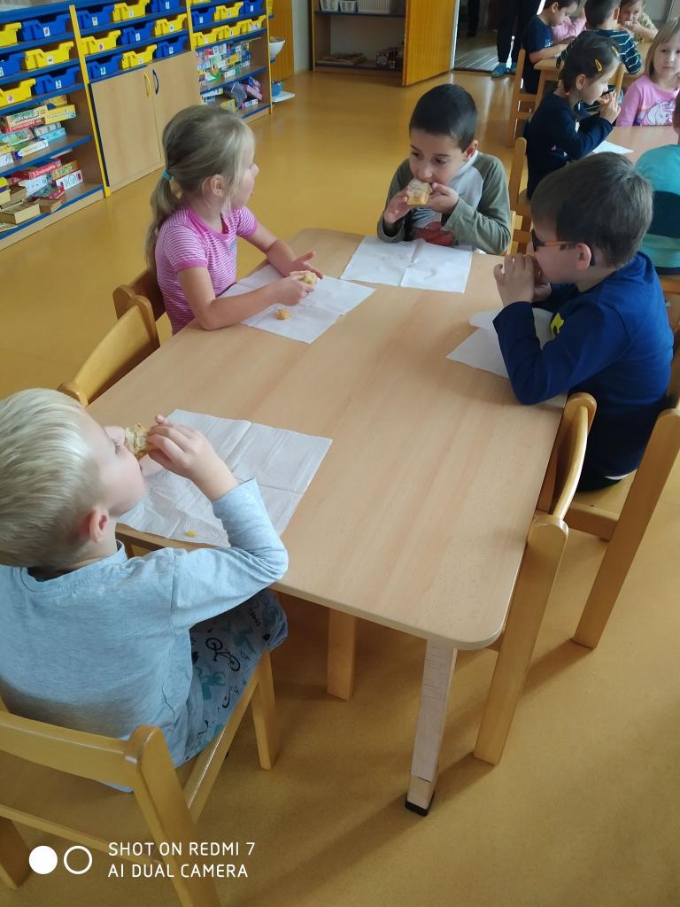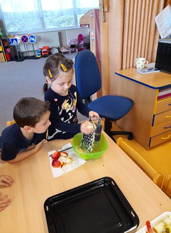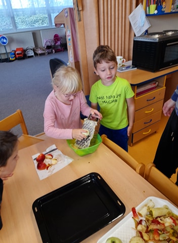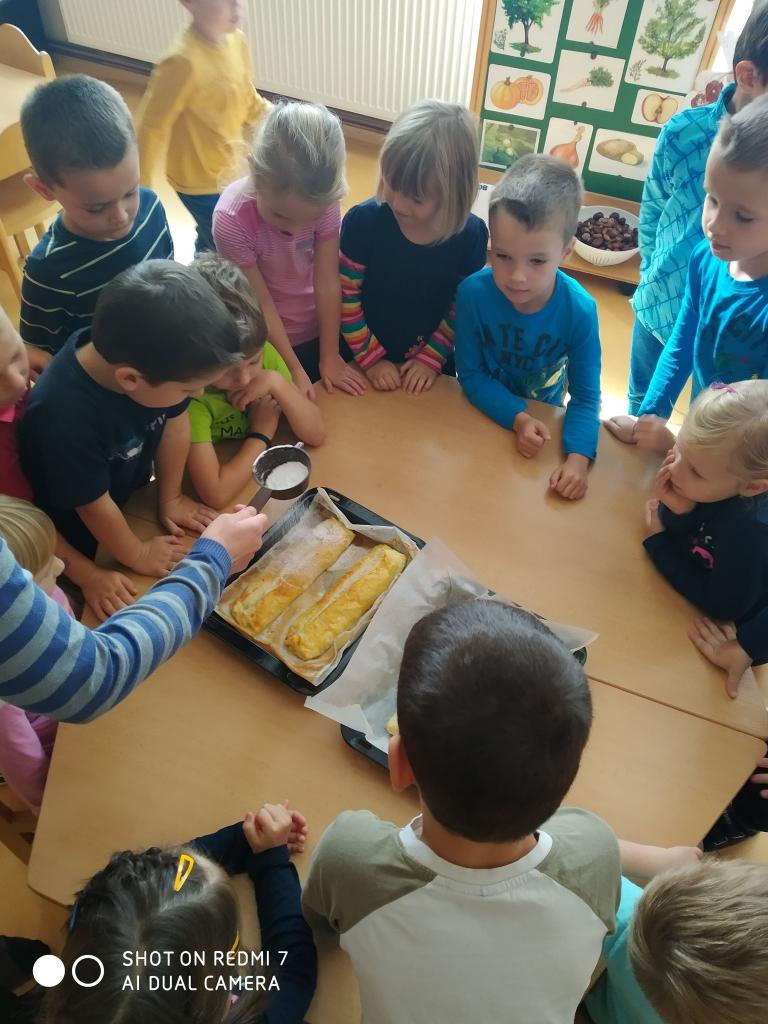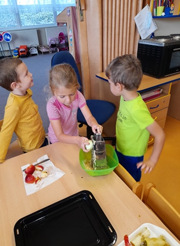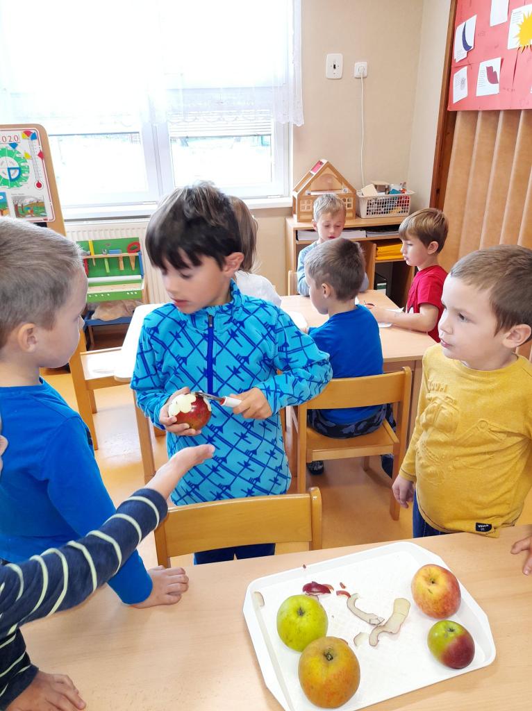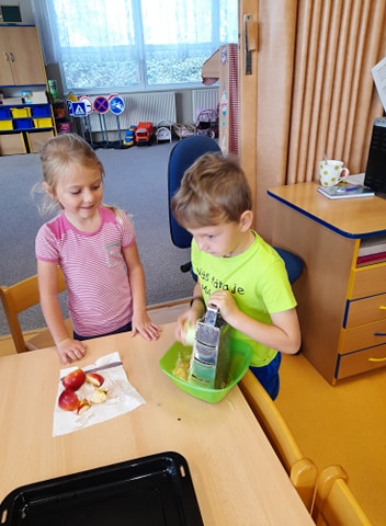 V pátek 9.10. 2020 jsme si udělali jablíčkový den. Děti si vyzkoušely okrajování, strouhání a krájení jablíček. Společnými silami jsme si upekli štrúdl. Byl moc dobrý :-)