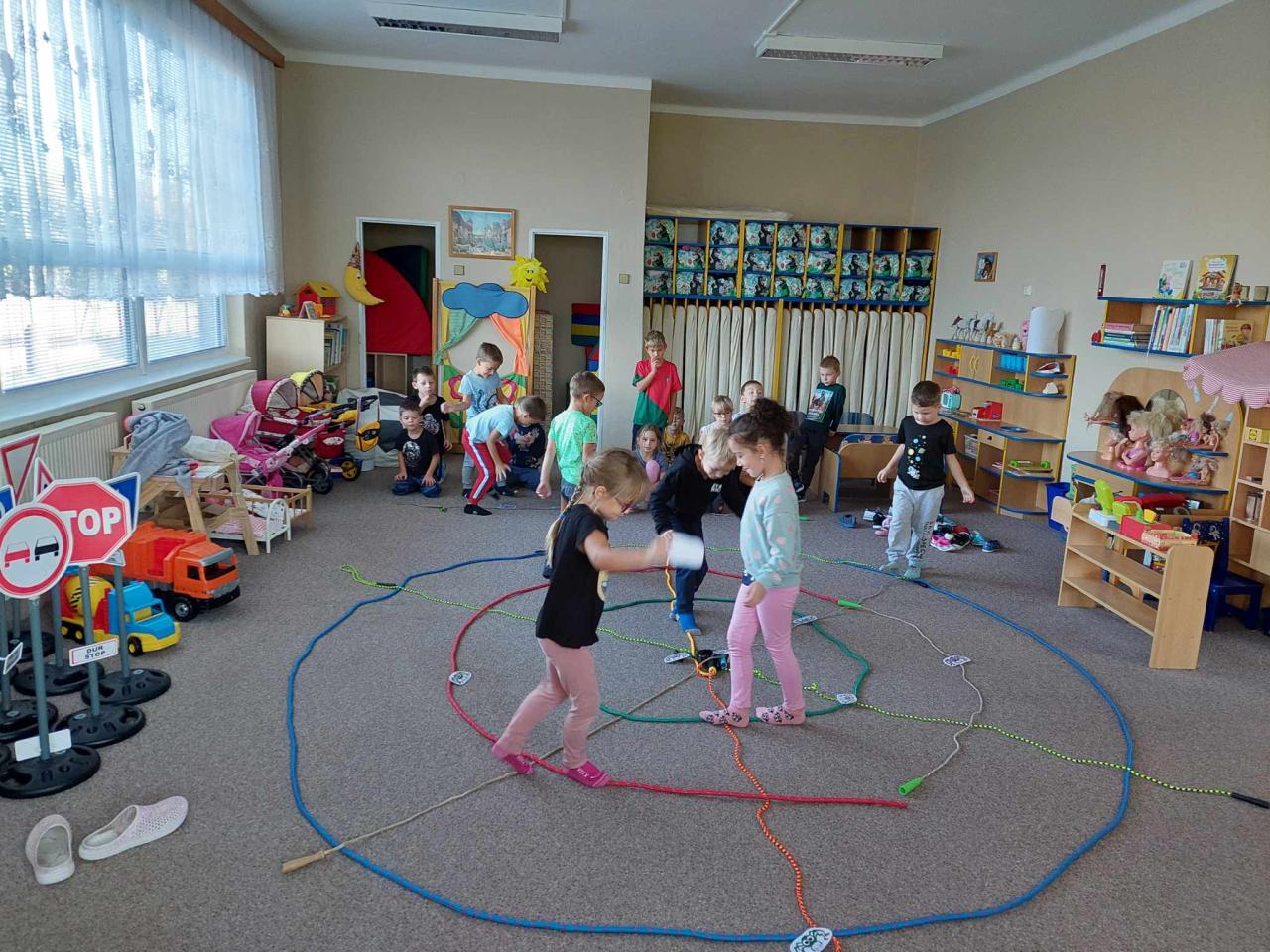 Děti se rozdělily do týmů a poté si společně zahrály hru "Pavoučí síť"