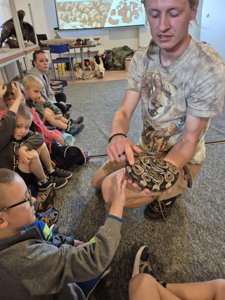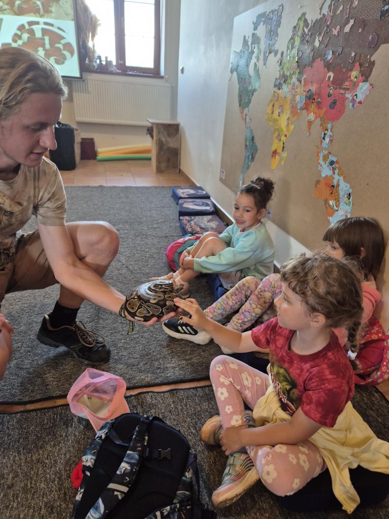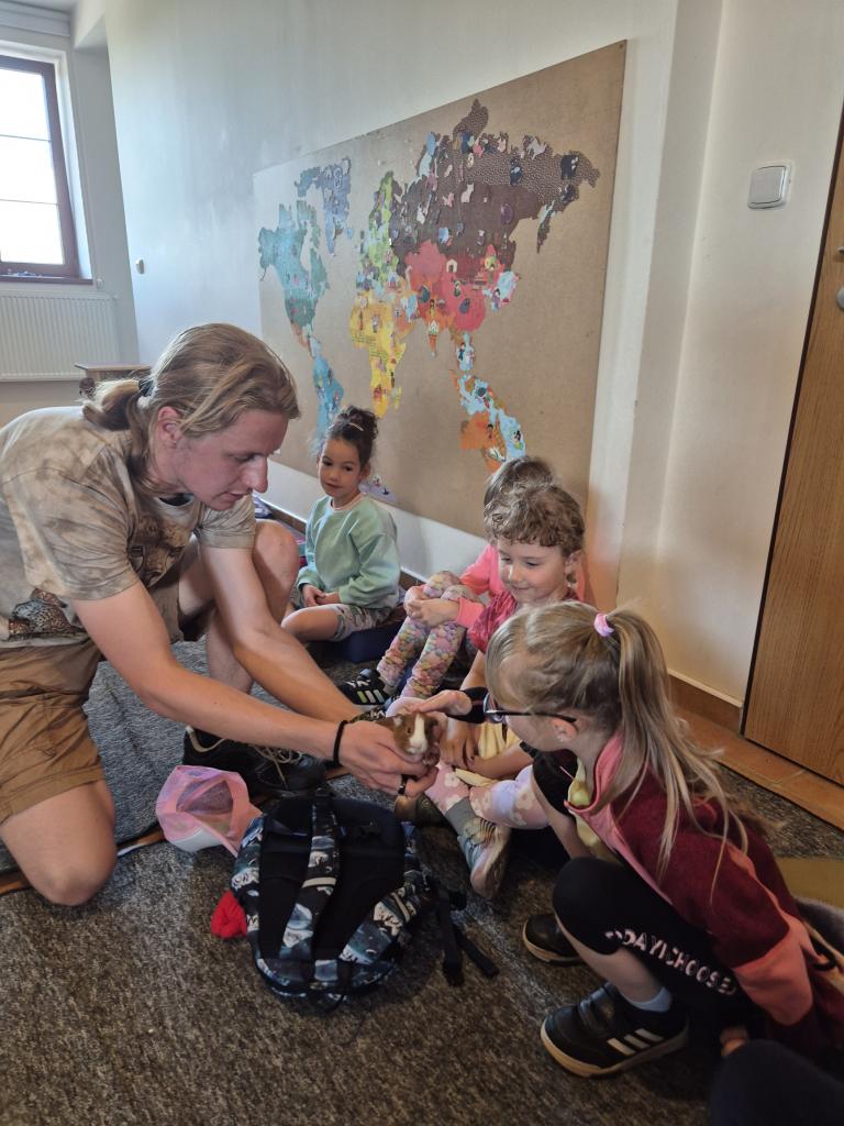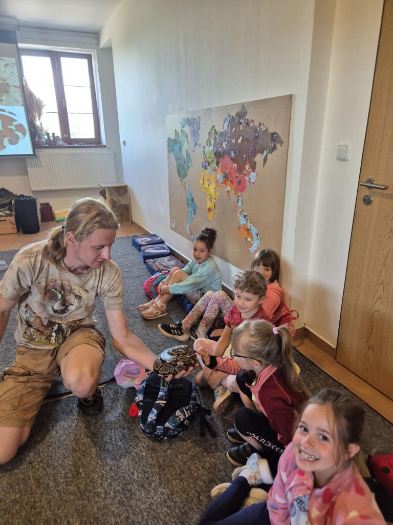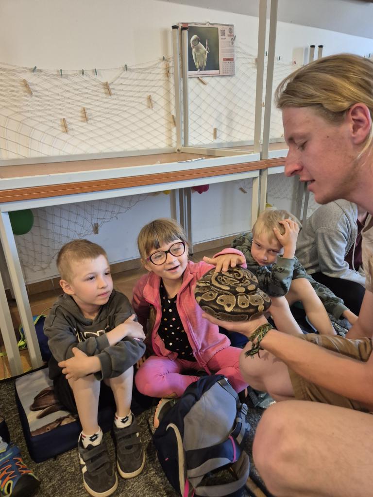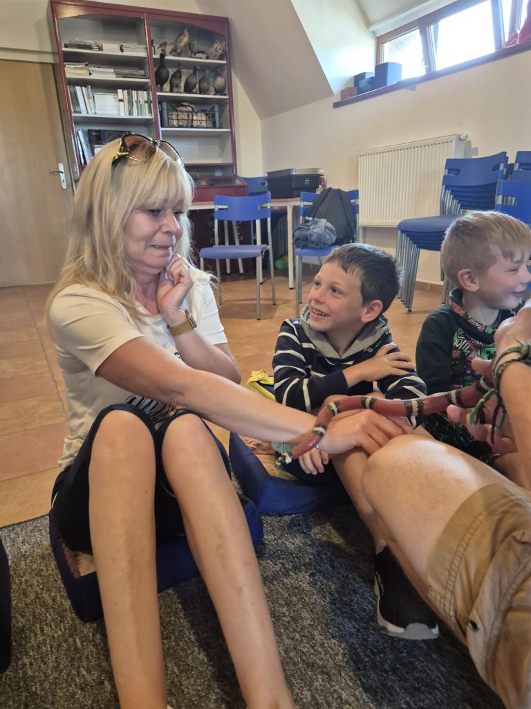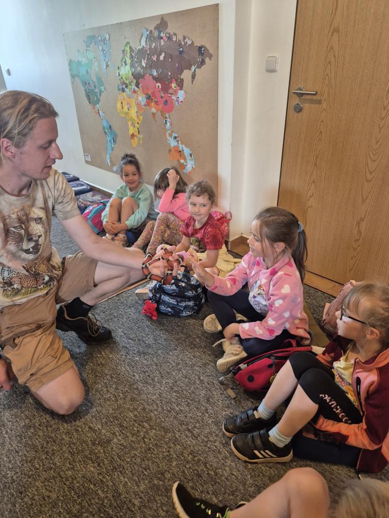 V úterý 17.6. jsme se vydali na dlouho očekávaný výlet, který se nám všem moc líbil. Měli jsme připravený program o maskování živočichů v přírodě. Seznámili jsme se s tím, jak a proč se zvířata v přírodě maskují a dokonce jsme si mohli pohladit korálovku, krajtu, gekona a morčátko.